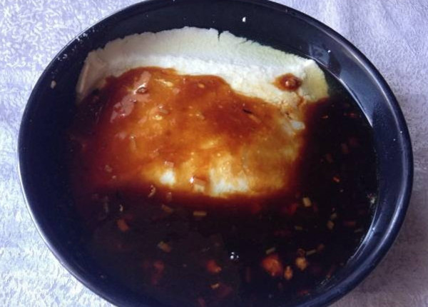 送的豆腐脑:这个豆腐脑还不错,卤的味道不咸不淡刚刚好,里面配了木耳黄花菜和笋,笋丝很好吃。豆腐吃起来是卤水豆腐,有传统豆腐的那种清香,软硬度很合适,因为实在很好吃,结果我多要了一碗,服务员也很干脆的给了。