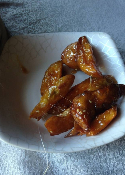 送的拔丝红薯:拔丝效果很好,糖裹得也很到位,而且一点也不会粘牙,就是红薯炸完放得时间可能有点长了,糖稀稍微有点硬,不够脆,不过红薯还是不错的,很甜,我个人还是蛮喜欢他们家送的这两个小菜的呢。