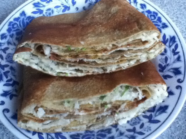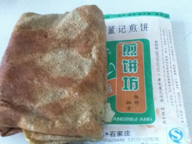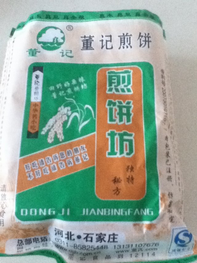 今天点的小米绿豆煎饼, 传统的绿豆增加小米, 混合搭配不错, 煎饼皮比传统的要大, 一般我们三口买两套就够了, 一个人吃不了了,个儿大