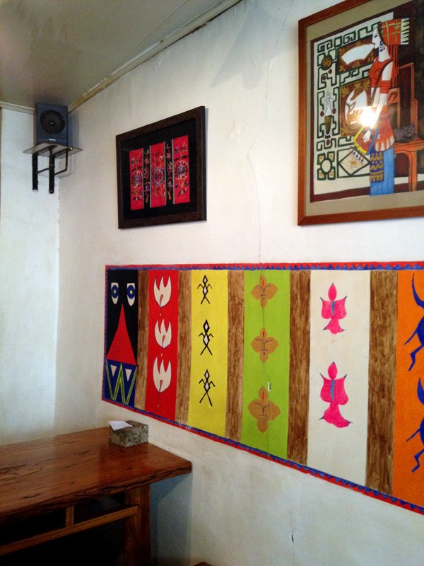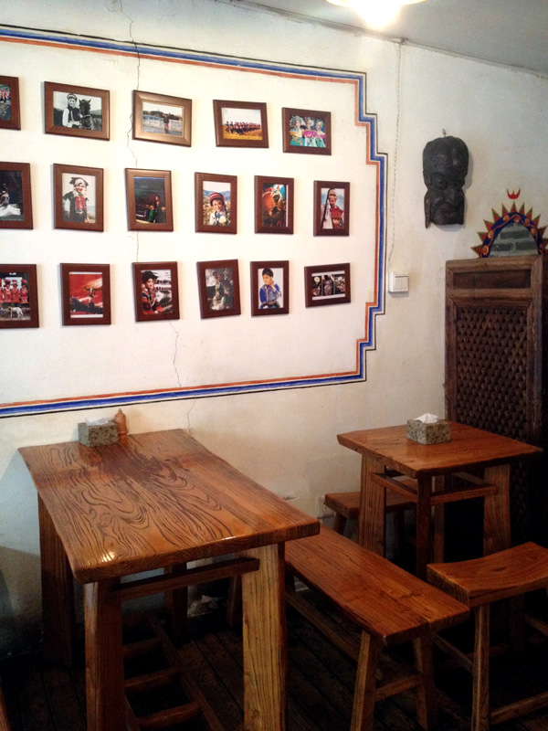店内木质的桌椅板凳,墙上有一些风格画和少数民族的照片。