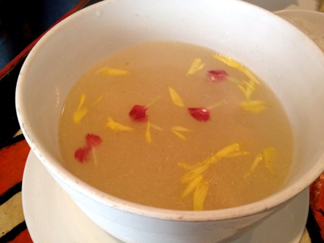 【七彩鲜花过桥米线】22元,米线还是要吃这种清淡的!原汤里飘着花瓣,料都集中在一个叠起来的盘子上,东西也不算少了。汤底的味道比较清淡,味道还不错,只是不太喜欢这里的米线,弹力太足了...