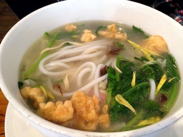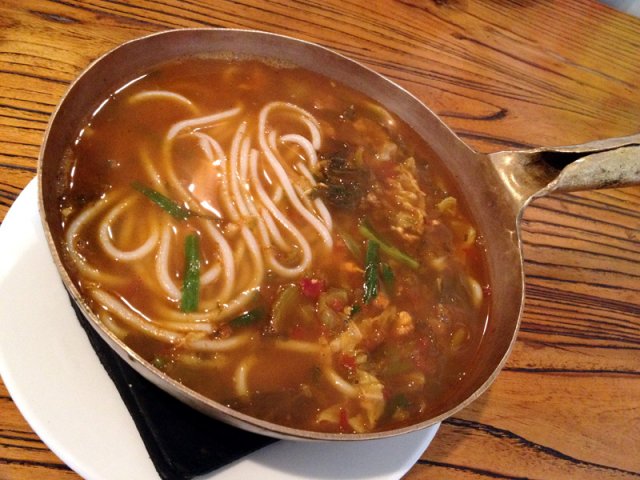 【铜锅米线】18元,点的最后一道菜。看起来有些浑浊的一锅,味道也确实重口味,酸辣交融。材料也比过桥单调一些,大上午吃这个有点不适应了。最后一锅米线剩了一半