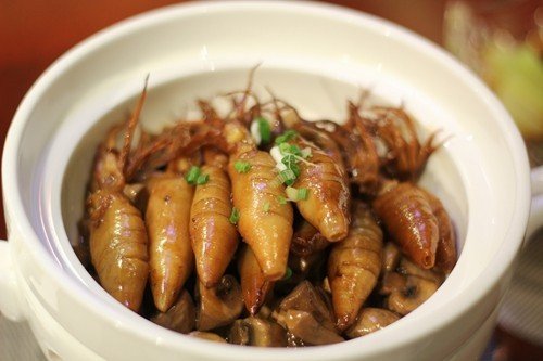 塞外口蘑烧籽乌 籽乌就是笔管鱼、海兔,咬开里面都是籽,较为常见的有干制品和冷冻品。口蘑味道鲜美,口感细腻软滑,与籽乌放到一起红烧至入味,色泽鲜艳金红,鲜咸。