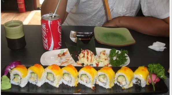 情侣卷据说是招牌哦 我俩也来个这个28米一份 颜色很给力啊 色泽好看 做得也很精致 尤其黄色的的点点小红珠子是亮点哦 汗 可惜没吃出来是啥东东数了下总共8快哦 不过味道好 里面还有黄瓜条和香蕉什么的 美容的好东东 朋友让我多吃了几块