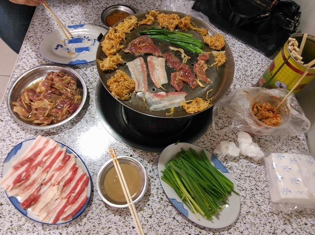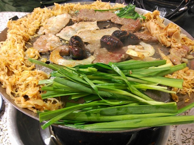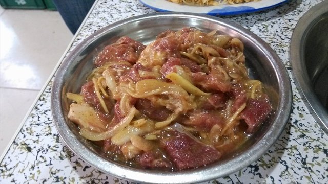 牛肉,小铁盆的,一大盆,拌的洋葱,调味过的,肉比较嫩,烤过之后甜甜的,特别好吃,尤其跟酸菜一起,蘸上干料或者麻酱都不错。