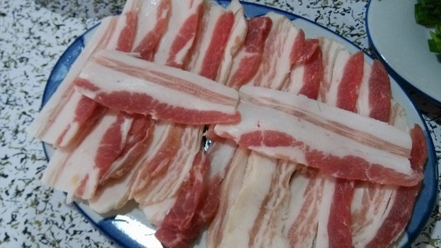 五花肉,挺薄一片,略肥一些,烤的金黄时候特别香,也挺好吃的。