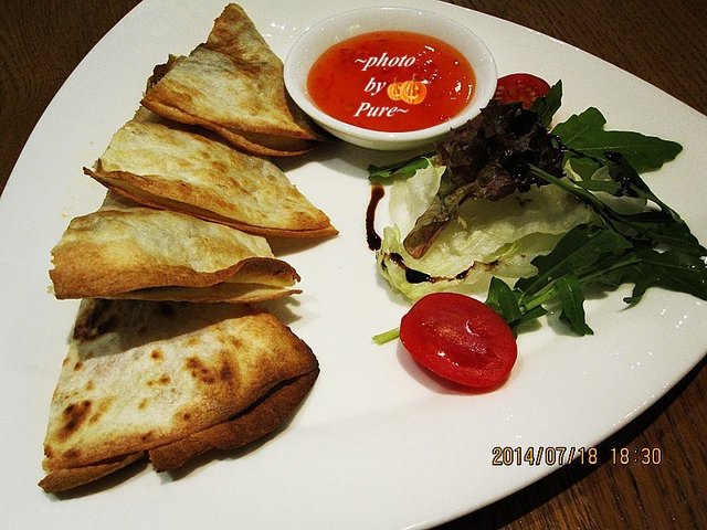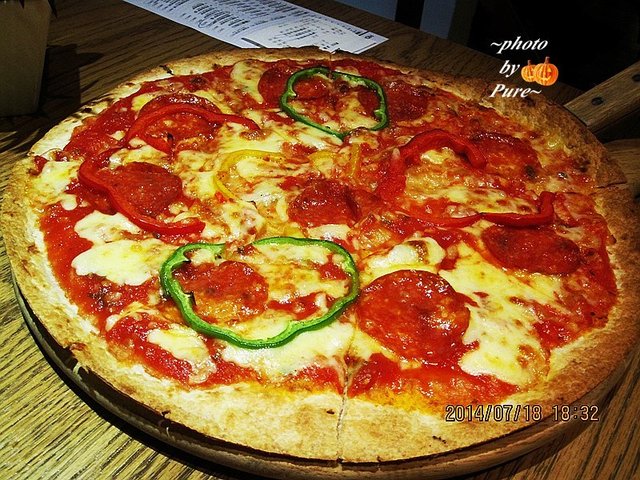 【萨拉米披萨】68元 说是特色是披萨,而且他们家都是薄地披萨,以为很地道。结果披萨上来特别单薄。虽然是薄地,但是不怎么好吃,不如马上诺的薄地披萨来的地道。妈妈的评价说像是在吃一块咸饼干一般无趣。有几片薄薄的萨拉米肉肠,其他的就是一些彩椒碎末。味道做得不好吃。饼皮不地道