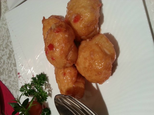 这道也是有一点点咸,如果你吃的比较清淡的话就很容易觉得咸,但是很大一个,炸过,不过我觉得还是很好吃的,有点像花枝丸的感觉呢~
