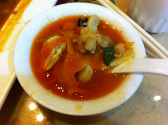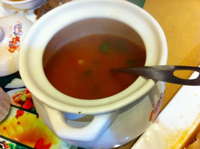 驼铃红汤味道偏甜,朋友觉得不是很好喝,但是我吃口偏甜,所以觉得不错,里面还有菌菇,带入了鲜味。