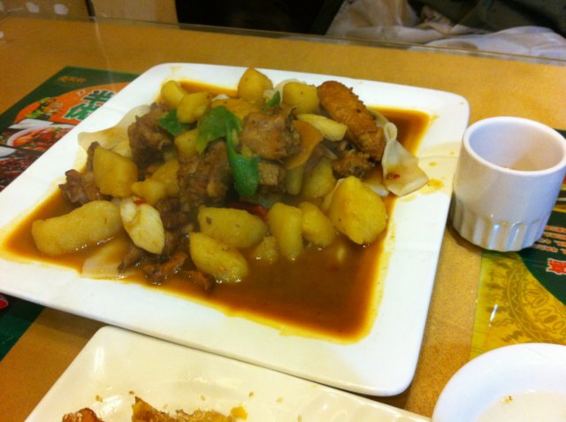 奶茶是点一份可以半价购买小盘鸡,还是挺划算的。另外点了拔丝地瓜,驼铃红汤,羊肉串,小羊肉