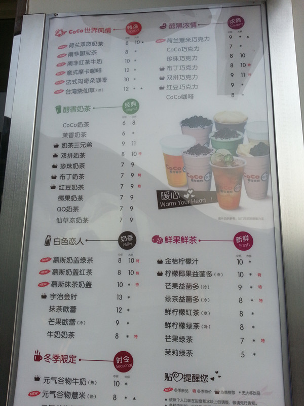 听说coco是从台湾传来的品牌,我其实以前对它没什么好感,因为喝了一次奶茶后,感觉老是有饱腹感,而且利尿,所以很怀疑它使用的奶或者珍珠会不会有问题。而且coco总是门庭若市的,在我看来为了喝一杯奶茶要排长队很不值得。不过最近听说coco用的都是鲜奶了,是不是真的我不知道,但最近天冷了,同事给我点了一杯热气腾腾的元气谷物薏米,有芝麻有薏米,都是我爱吃的,还有淡淡的奶味,搭配在一起,口感蛮好的,喝下去也蛮舒服,让我有了点改观。其实我觉得coco能做出这么多连锁店来,说明它还是有很多比其他奶茶店过人的地方的,只是希望中国的企业吧,特别是餐饮业不要因为客户人多,就降低服务的质量。就比如说我去台湾的时候,随便找了家没名气的小店买的奶茶,服务员非常热情,问我要什么温度的,什么甜度的,加不加冰等等。我想coco最初也是这样的,但渐渐地就不再问这种问题了。顾客不提,店员就按最普通的模式来操作。还是希望他们能以客户为本吧,这样才可能长久。