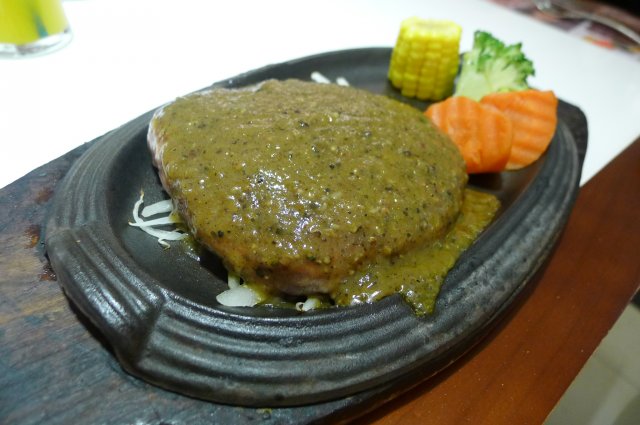 @ 小蜜牛排/88块,牛排虽然说是170g,但感觉还挺多的么,上面要了黑椒的酱,带点辣辣的比较喜欢,不过小蜜的话是不是原来应该是甜的呢?我要了7分熟的,感觉还有点红红的液体,不过吃上去还是蛮嫩的。里面还有胡萝卜,很甜很酥,我把它们都干掉了,还有西兰花,不过太生了不喜欢,还有甜玉米也还不错,当然啦,怎么少得了洋葱~烤过的洋葱就是不错