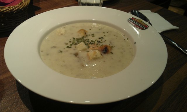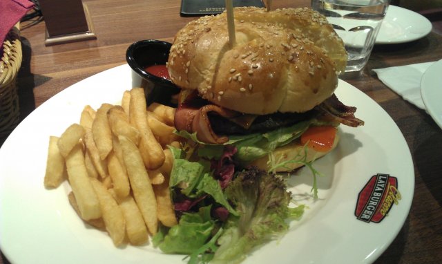 因为看过亲们的帖子,翻起菜单也是格外的轻车熟路,点了个火烤蔬菜培根牛肉堡,一份奶油蘑菇汤,拉亚乐拼盘~坐等上餐~