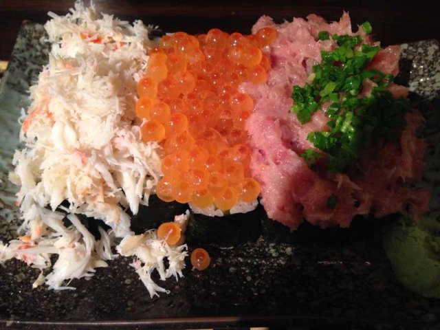 金枪鱼寿司,强烈推荐!特别推荐半熟金枪鱼寿司,金枪鱼表面是用喷枪喷熟,底部贴近米饭处还是生的,个人超级喜欢这个,入口即化有木有!!!全生金枪鱼寿司,卷寿司,包紫菜寿司,大家全部吃到爆,上了两盘之后意犹未尽,结果又追加了一盘。。PS每盘价格不低400米要。。