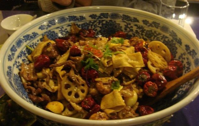 十分钟左右,香锅登场,我的天啊,这么大一个瓷碗,真是壮观,因为别家都是用不锈钢的盆的,它家居然是磁盆啊,试着端了一下,非常的沉,好感度陡增,一看里面的菜,好感度就又增加了,量如此之大,真的是没偷工减料啊,完全够三个人吃了啊,要了两碗米饭,马上开吃(可能是我们去的太晚了,米饭居然是凉的,服务员马上端下去给加热了)。香锅的辣度刚好适中,味道也不错,就是我们吃的太急了,不一会就感到油腻了。