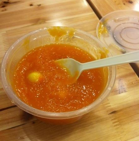 看着这家店开业,刚开始没啥人气,不到一个月就开始生意好起来了,因为没有看到他家在外面派发广告做宣传,所以心里想肯定是他家的东西好吃才会吸引客人的。第一次是和老公去的,点了冷面和拌饭,几个小姑娘态度都很亲切,告诉我们哪些是辣的,哪些是不辣的。后来正好看到他们从厨房端出来一锅刚刚煮好的南瓜粥,感觉很不错,于是打包了一份带回去给小宝宝吃,那个时候宝宝才8个月大,吃他们家的南瓜粥吃得都不肯停啊。从此以后,我就经常下班往哪里绕一下,打包一份南瓜粥了。