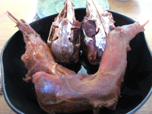 说起兔头,我吃过双流老妈的和乔外婆的。这里的兔头不要看着它其貌不扬的,其实味道还不错哟,卤的挺有味的,我嗜辣,所以吃的是辣味的,因为等其他朋友导致兔头兔腿凉了,味道没有那么好了。兔头辣味的没有双流老妈和乔外婆的辣。