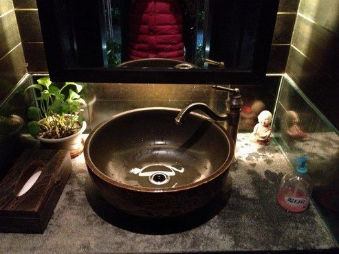 洗手间的水盆用陶器装饰也是古朴典雅的主题呢。
