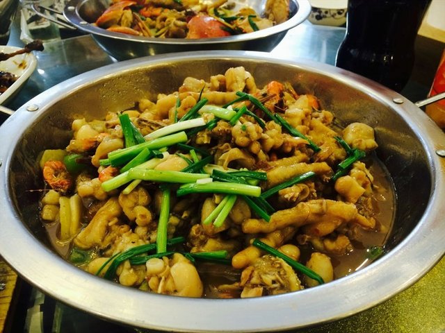 这蟹伴着这特殊的香味 十足的鲜美,锅里的年糕 花菜 鸡爪 都是么么哒的好吃。
