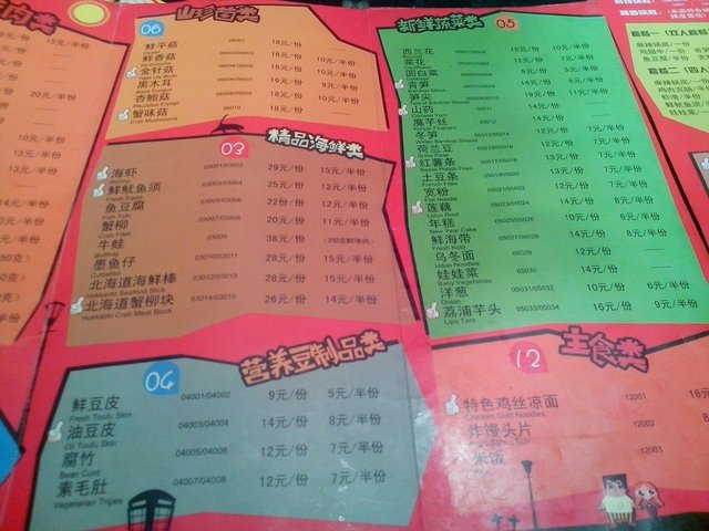 看了下菜单,价格小贵,锅底是18元一份儿,可以选择辣度,微微辣,微辣,重辣,重辣,加麻加辣。还可以选择套餐,双人套餐111,便宜5元。套餐二是四人餐,199元,便宜9元。感觉优惠力度不是很大。可加入的食材种类还是挺多的。鱼丸,肉类等等都可以点半份儿,适合女生。