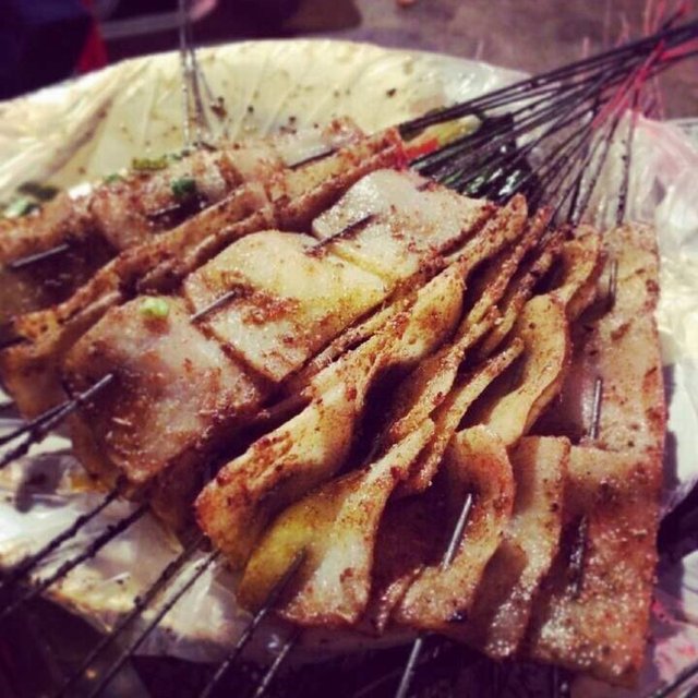 鱿鱼个头不算很大弄得比较干净,上面的筋膜都撕去了。鱿鱼上面涂了很多调料,所以吃起来很有些咸,很耐嚼,不过鱿鱼须蛮少。肉串味道蛮好,肉特别入味而且烤的很香,肉软不塞牙,做法和味道都比较地道。