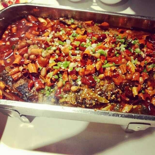 特地来这边吃烤鱼的,人哈多的,排了半个钟头才进去。服务员推荐我们吃了冬阴功口味,但是看菜单上还有什么销魂十八香,那个是不辣的,不知道好不好吃。冬阴功口味是真蛮好吃的,我们选的是刺少肉多的清江鱼,端上来的时候鱼身上都是辣椒还以为狠辣,但是实际吃下去还好,越吃越入味,是酸酸辣辣的味道,点了大份的蔬菜拼盘叫撒花枝招展,五六种蔬菜吧就,花生沙冰芒果冰沙好好吃,量也多。两个人吃了三斤不到,吃完身上都是火锅味,回去要好好洗洗。