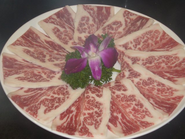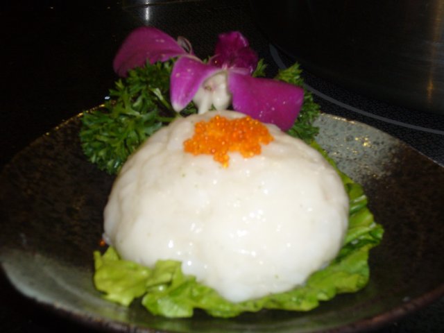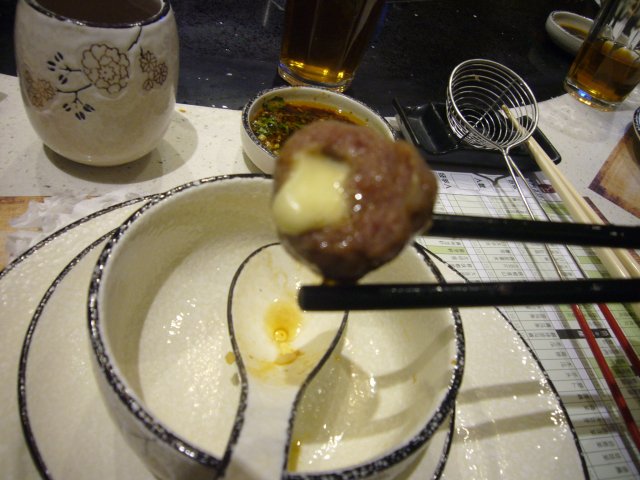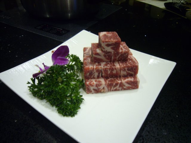 雪白的汤底,一个是木瓜雪耳海底椰,一个是香西白贝汤底,也就是海鲜汤底,前一个浓浓的椰子香味,海鲜锅倒是没太大感觉,可能是香菜把味道都夺走了,只闻到香菜味,首先下的是丸子,很有特色的两个丸子就是乌鸡丸跟牛肉丸,第一次吃乌鸡肉做的丸子,居然也很Q,很好吃,牛肉丸大家都吃过,可是这个可不是一般的牛肉丸,是包心的咧,包了芝士,爱不释口,还有就是迫不及待要提的雪花牛肉和雪花牛肉粒,肥瘦的比例恰到好处,吃进去满是脂肪的香味,但是不腻口,有D童鞋不听劝告还没熟就想吃,结果咬不动,新鲜的牛展肉和鹿肉都 很嫩,这个就没什么特别,虾滑倒很不错,里面有鱼籽,脆脆的,很爽口,后面还上了花枝片,云吞,甚至寿桃牌面条,呵呵,好熟悉的面条,寿桃牌,蟹粉球,里面好多蟹粉,就是外面包的丸子不太好吃,只想吃里面的蟹粉,有个鱿鱼筒,还带膏的,吃完发现写着北海带带膏鱿鱼筒,自言自语到,应该不是日本过来的吧,只是这么写而已,甜品系芒果布丁,灰常的好恰,滑滑嫩嫩的,大家都加了一份,今夜全肉宴,吃的好畅快。