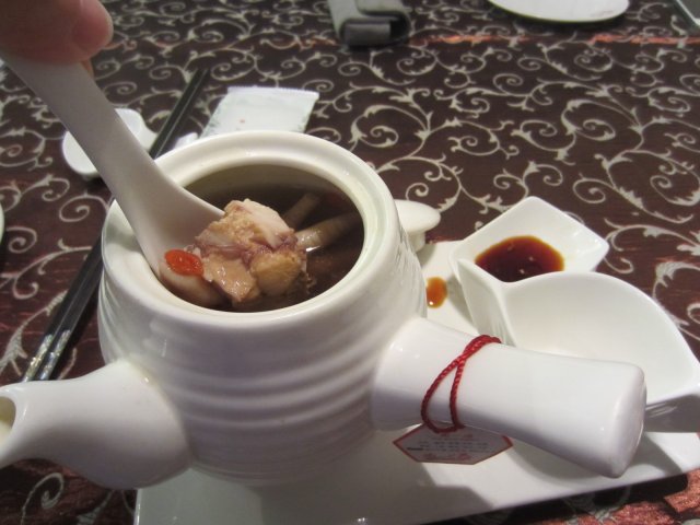 我点的是招牌的尚一汤。里面有猪肉,鸡爪,枸杞,小鲍鱼,虾干。药材忘记什么名字了。汤很清,一点都不油腻。但是很鲜美啊。 里面的材料蘸着店家自己配的调料。味道也很吸引人。