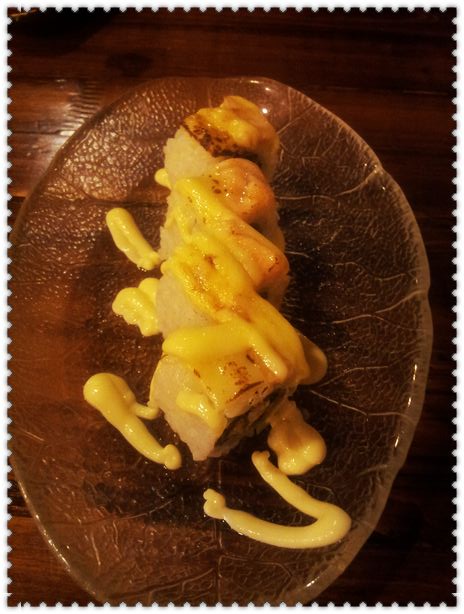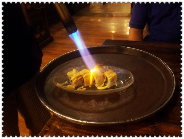 创意寿司~ 选的六文钱火焰中卷,先用喷枪的火焰,把寿司卷最上面的芝士溶化,看着倒是挺好玩的~ 寿司味道还不错,我喜欢芝士的味道,我饿了,呵呵~~