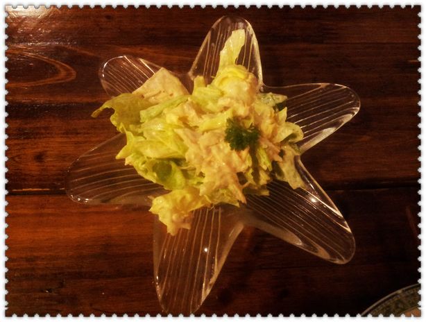 沙拉~ 选了金枪鱼沙拉,盛装在六角形的玻璃盘中~ 盘子倒是漂亮,只是沙拉是已拌好,很随意的放入盘中 ,所以卖相全无,至于味道也一般般吧~~