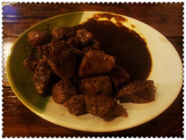 日式铁板烧~ 选了火焰杏仁牛排和铁板明虾~ 因为没坐在铁板料理台前,所以师傅的制作表演并未欣赏到~ 牛排是已经切成的小块,肉质非常嫩,量也挺大的~ 浇的黑胡椒汁不浓稠,没有杏仁,一问,服务员说杏仁没有了~~