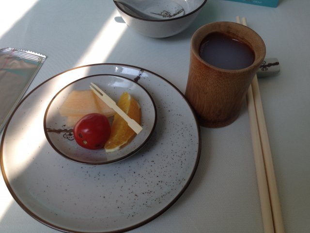 酒吧的服务生貌似是东南亚人,一入座先没人上了一份点心和米浆,甜甜的水果搭配淡淡的米浆倒也相得益彰。