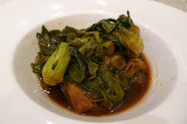 @ 宁波金钱菇烤菜/12块,因为这里怎么也算是宁波特色的饭店吧,那就来个宁波烤菜吧~菜的装盘完全没有菜单上的好看,看上去乱哄哄的,颜色又是黑黄色,感觉像坏掉的菜一样。。。而且没有那个菇。。。吃上去一开始觉得还不错,后来就觉得太咸了。。。吃的多了就吃不下去了。。。