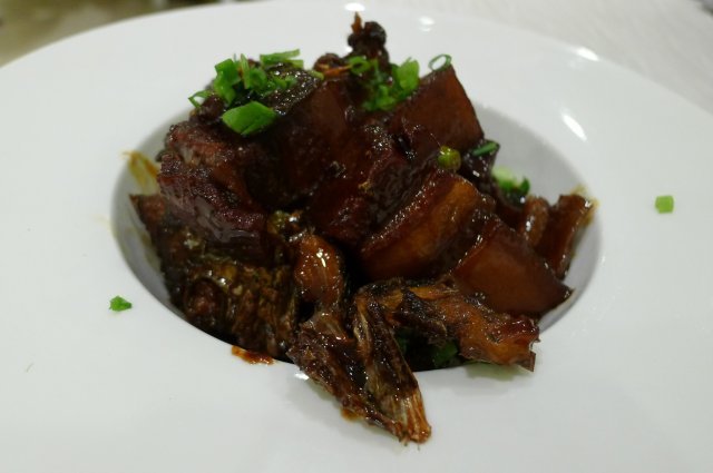 @ 黄鱼鲞红烧肉/55块,上来好大一个盆子,里面东西么当然只有一点点啦,立马就把桌子的一半占据了。。。看到了这个浓油赤酱的东西我本来应该很有兴趣,但这次例外了。。。因为那里的水只有一杯,不续杯,另外要水是要收钱的。。。于是吃这些东西感觉越吃越咸。。。里面的肉的味道还不错,但是黄鱼就感觉有些腥气,不喜欢。肉么主要就是有很多肥肉。。喜欢的人应该挺喜欢的吧。。。
