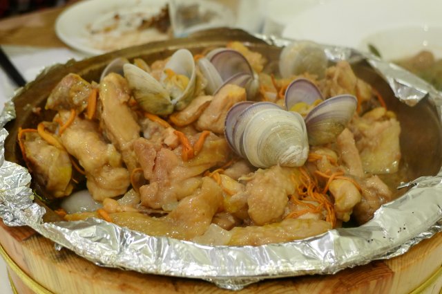 @铜盆贝贝蒸鸡/68块,这个样子看上去蛮灵的,一上来先是锡纸包住的,然后服务员帮你把锡纸切开来,一股热气立马就出来了~里面鸡肉是满嫩的,蛤蜊么也还行吧,就是唯一的缺点,太。。。咸。。。了。。。里面有些红红的菜,不知道是什么东西,吃着感觉还不错,还有些洋葱也挺香的,要是他能添免费的水就好了。。。