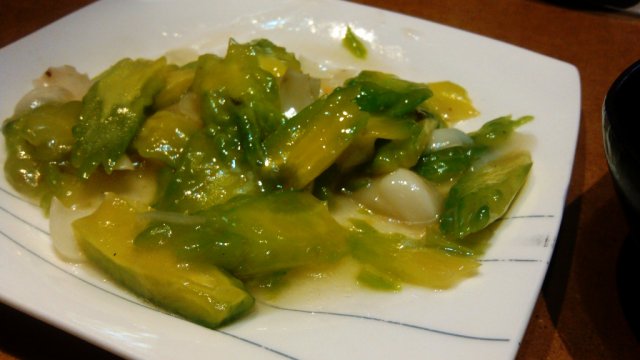 有一道菜是百合炒苦瓜,虽然这两样食材都比较常见,但在一起吃我还是第一次见,苦瓜的苦味去得比较淡,和百合炒在一起口感清爽,不过芡汁太稠了些,有点儿损口感。