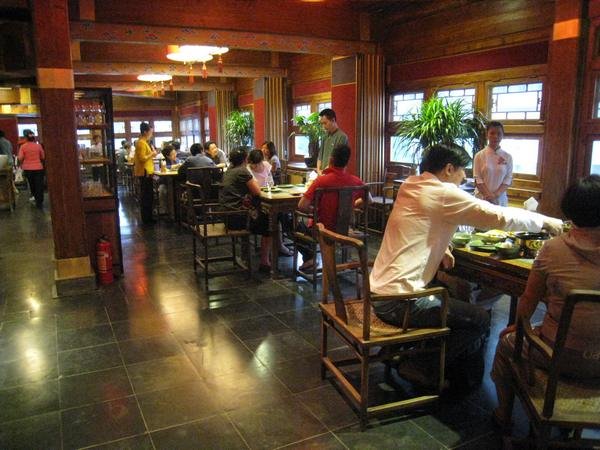 服务员都穿着唐装,每桌都配有一个服务员,随时有要求都会满足你