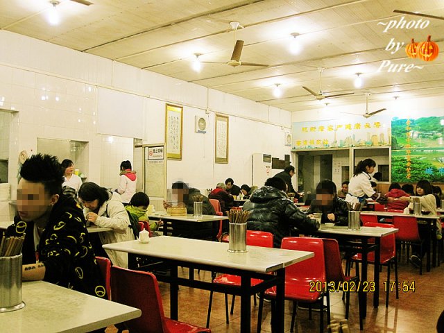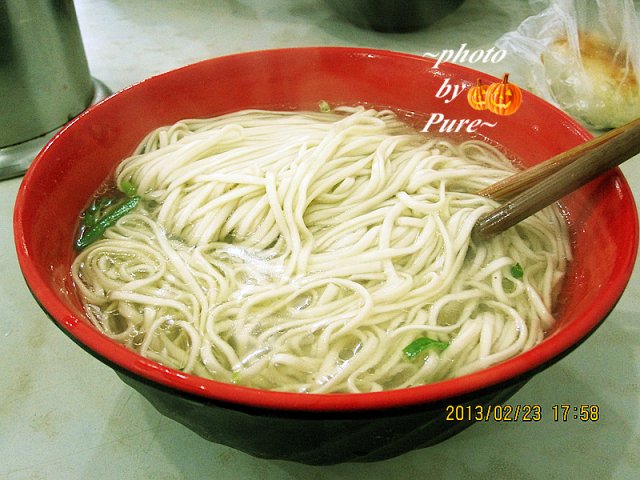 【阳春面】3元。我也很诧异怎么他们有卖这个的。我想既然敢拿出来单卖肯定是特色。小时候在妈妈单位里吃过一流的阳春面(好吃得就跟作家笔下描写得那么出色)就试试看吧。没想到真就一碗光面。面劲道。汤头鲜(靠味精)不过不在是记忆中小时候的味道了。妈妈说,那时候的阳春面都是荤汤,自然好吃。现在就是速成的味精汤底。这个水平也不错了。后面一个小姑娘点的辣肉面。浇头感觉好少哦