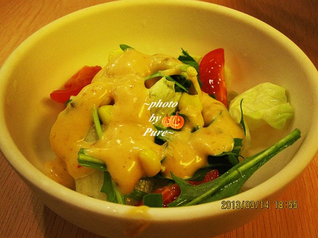 【色拉】小色拉很特别。拌的色拉酱是酸酸的。类似话梅般的酸味。我很喜欢这种神奇的味道。吃口清爽,开胃菜。