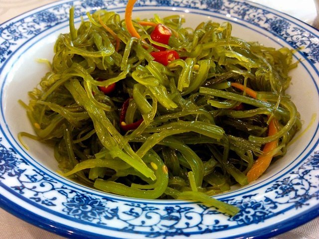 凉拌海藻,凉菜的量比我们想象中要大,青绿色的海藻搭配一些红辣椒和胡萝卜丝很漂亮,海藻略有些筋道,不过很好嚼,口感咸鲜清爽微微有些甜味,作为夏天的开胃凉菜非常合适。