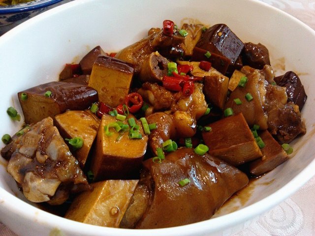 猪脚鸡蛋干,鸡蛋豆干切成大大的块儿和切块的猪脚炒制而成,猪脚应该是事先卤过的,很入味,肉皮紧实,里面的肉不多但很香,鸡蛋豆干韧劲儿十足,口感比较滑,还有微微的熏制味道,大口嚼起来非常过瘾。