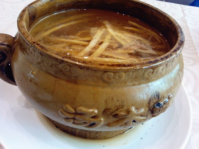 天目笋老鸭汤,可以按位上也可以按例上,套餐是1例。放在瓷罐里的汤是从蒸箱里直接取出来,稍微放置一下取下上面密封纸端给我们的。汤色较清,上面有一小层油花,闻着并没有很香浓的味道;里面的干料真的很多,笋丝有韧劲儿,在鸭汤中炖煮后增添了口味,更鲜美了;切成了小块的鸭肉分量真不少,估计都沥出来炒盘菜也差不多够,因为长时间的炖煮焖蒸,大部分鸭骨头都可以嚼碎吃掉了,当然,一些大个的骨头和关节类的不可以,不过可能用的是老鸭或者炖煮时间过长,鸭肉有些发柴;汤的口味比较清淡,不浓不腻,不错。