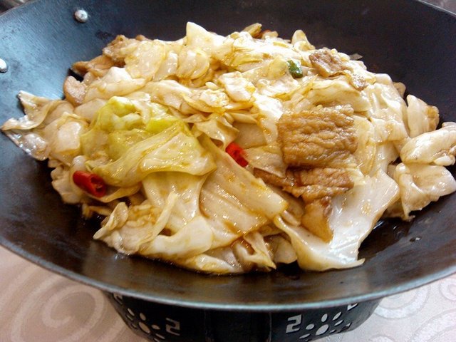 干锅手撕包菜,这里唯一的青菜类菜品,不过里面居然有大片的五花肉,不得不说商家真够实惠的。卷心菜脆爽可口,里面的小辣椒还是挺带劲儿的,越吃越辣。