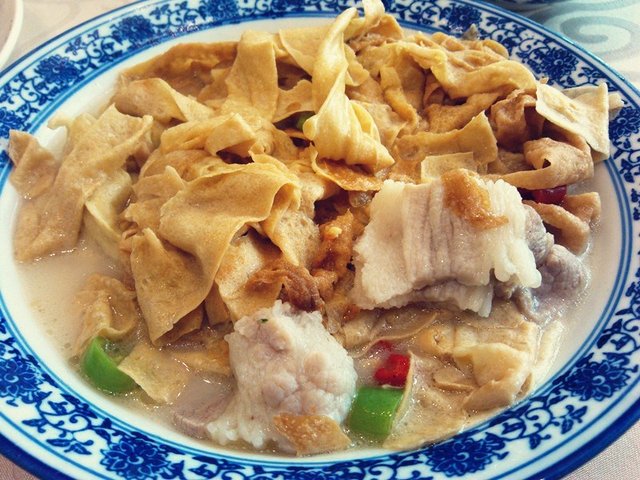 井冈山豆皮,本来觉得自己吃过不少豆皮,干豆皮、油豆皮,这种豆皮还真是一次吃到。这道豆皮是半汤菜,豆皮看起来更像天津的锅巴菜,软塌塌地泡在高汤里面,但吃起来又不像泡在汤里的锅巴菜那么绵,虽然软软的,但多了几分韧,吸饱了汤汁的豆皮浓香味美,除了豆皮,这道菜里还有大片的五花肉,看着有些东北菜的豪迈。