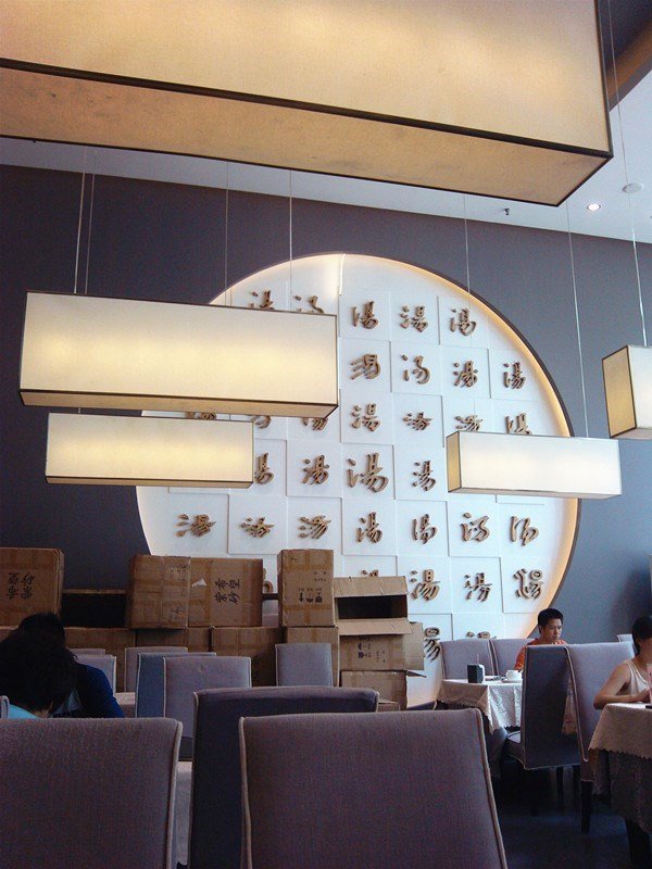 整个餐厅具体有多大我也不知道,我们直接被引导一楼大堂内就餐,正对面的背景墙上各色字体写就的“汤”字显得很有底蕴,店内装修不复杂,不过配色方面还挺讲究的,显得大气雅致,厨房是一排透明的操作区,一些菜品的制作可以直接看到,相对放心一些。因为层高较高,厨房上面还有个餐区。