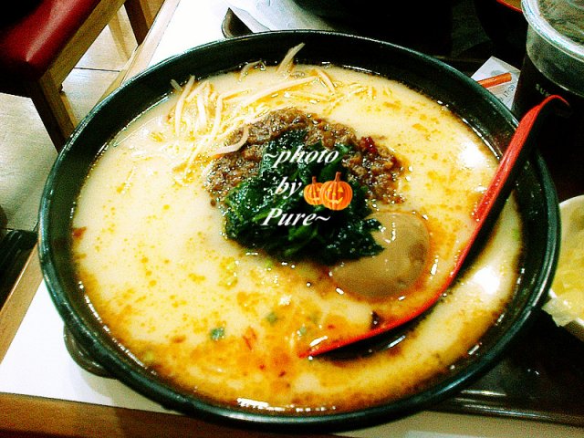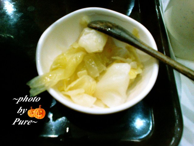我点的是双份料辣肉面。16元。如果是单份辣肉的浇头面12元。我比较黑心,点的双料的。上来很大一碗。拉面看起来相当诱人的。直接撒上辣肉和海带(是冷的),拌开后浓郁的汤汁略有辣味,相当可口啊。就是不明白这个面条怎么那么烂,跟烂糊面一样。河马公道的说,他最讨厌吃烂烂的面条了,不过汤头很鲜美。里面有辣肉,有海带,还有些黄豆芽。性价比还不错,加了5元得到的是酸梅汁和泡菜一份,泡菜只有1点点