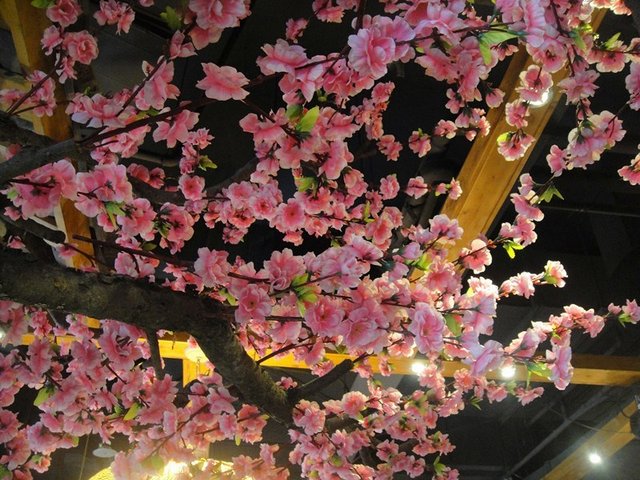 店内有点武侠气息。木质桌椅,木质房梁,服务员穿的汉朝服装,很有特色。分为两个大区,还有仿制的桃花树,环境真心很赞!