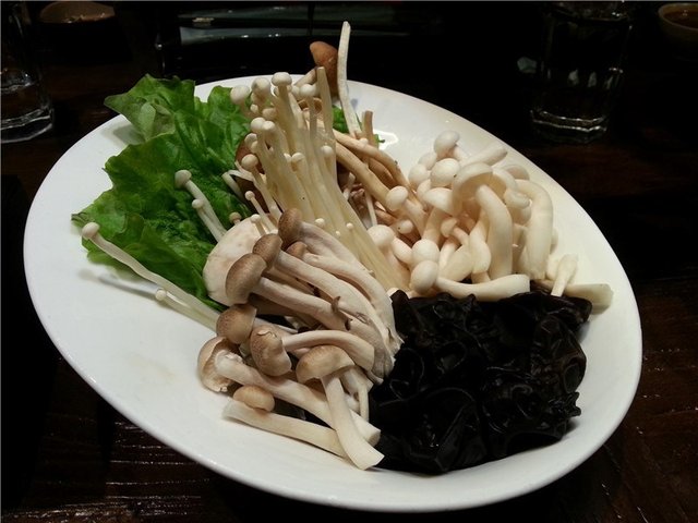各种蘑菇和木耳拼成了一盘,菜量不是很大,蘑菇白胖丰满,吃着劲道弹牙,鲜美多汁,是吃火锅必点的菜品。