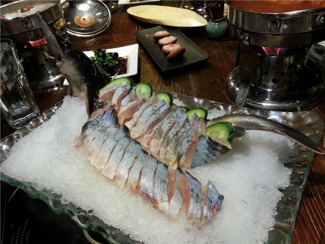 托盘挺大的,鱼摆在了冰上,虽然鱼片被片了下来,但鱼还是活的,觉得有些残忍。鱼不是很大,鱼片挺厚的,不过没有小刺,鱼肉吃着挺细腻的,但不是很鲜。