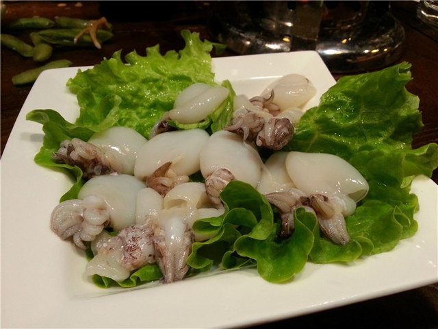 墨鱼仔收拾的很干净,没有杂质,煮熟后缩成很小的一团,吃着又Q又鲜,是吃火锅必点的一道菜。